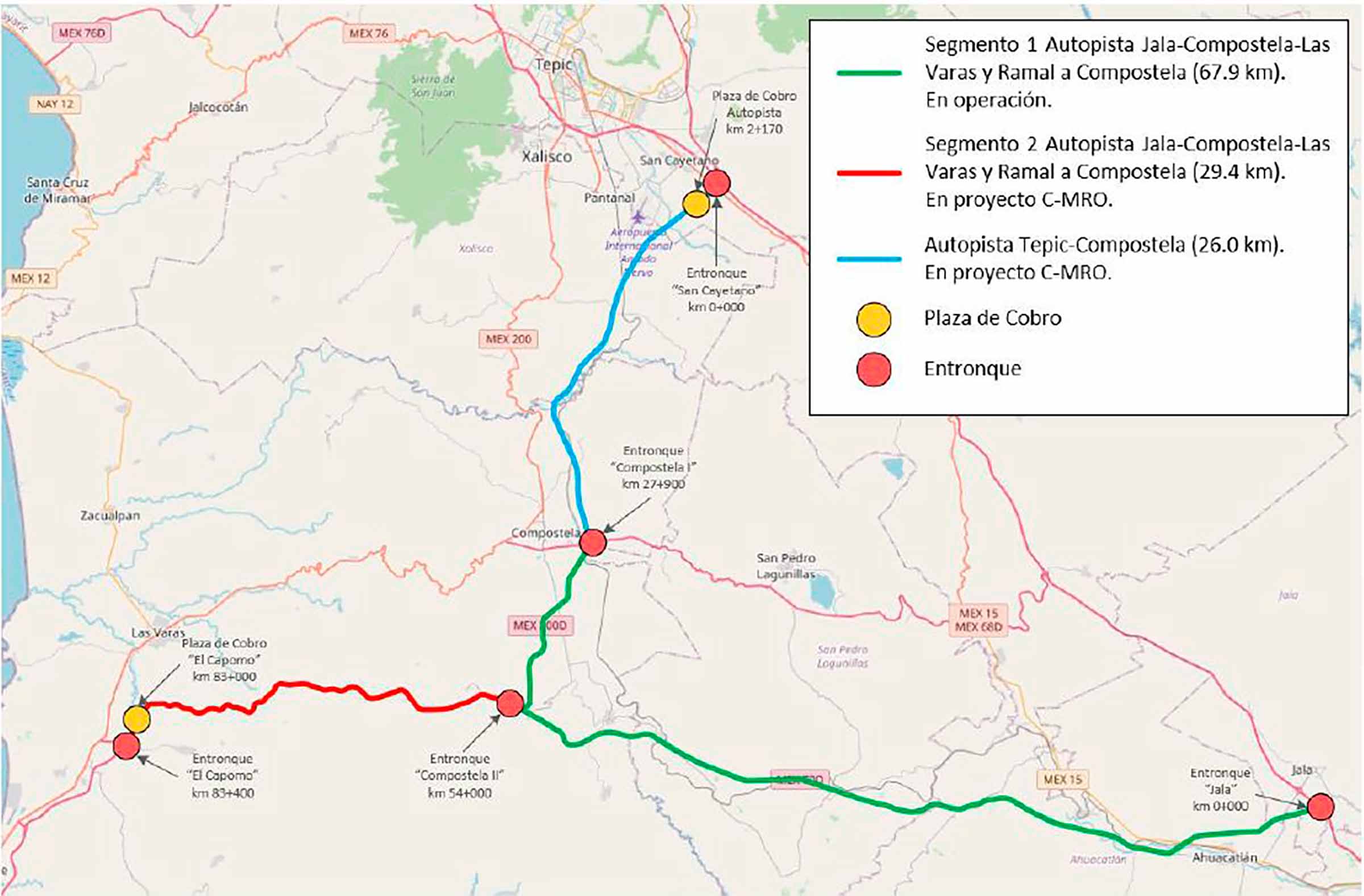 La Autopista Jala – Compostela – Las Varas y Ramal a Compostela está dividida en dos Segmentos, el Segmento 1 se compone del kilómetro 0+000 al kilómetro 54+000 de la Autopista Jala - Compostela que entronca con la Carretera Federal de cuota 15 D Guadalajara – Tepic (en Jala) y el Ramal Compostela el cual tiene como cadenamiento del kilómetro 27+000 al km 40+262 y este a su vez hace entronque con la Autopista 68D; y el Segmento 2 de la Autopista Compostela – Las Varas. La Autopista Tepic – Compostela tiene una longitud de 26 kilómetros que van desde el kilómetro 0+000 al kilómetro 26+000 de la Autopista Tepic - Compostela que entronca con la Carretera Federal de cuota 15 D Guadalajara – Tepic y con el Ramal Compostela el cual tiene como cadenamiento del kilómetro 27+000 al km 40+262 y este a su vez hace entronque con la Autopista 68D.